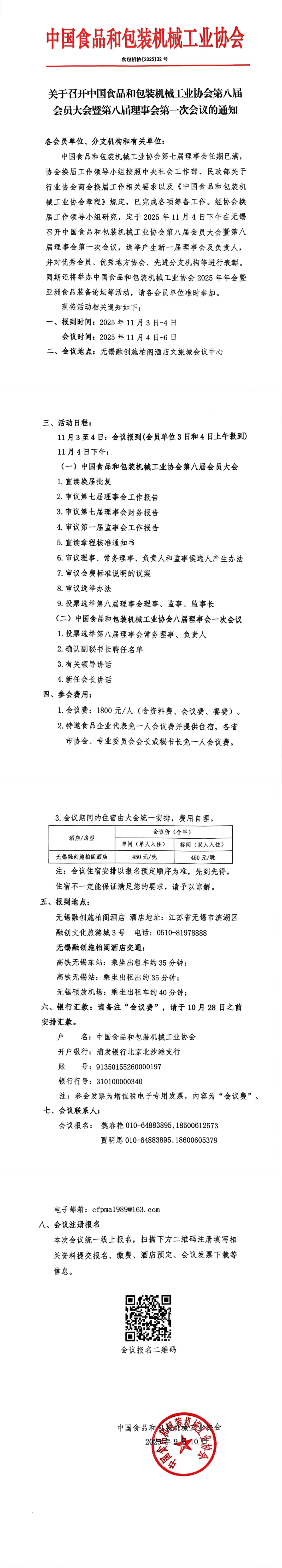 关于召开中国食品和包装机械工业协会第八届会员大会暨第八届理事会第一次会议的通知