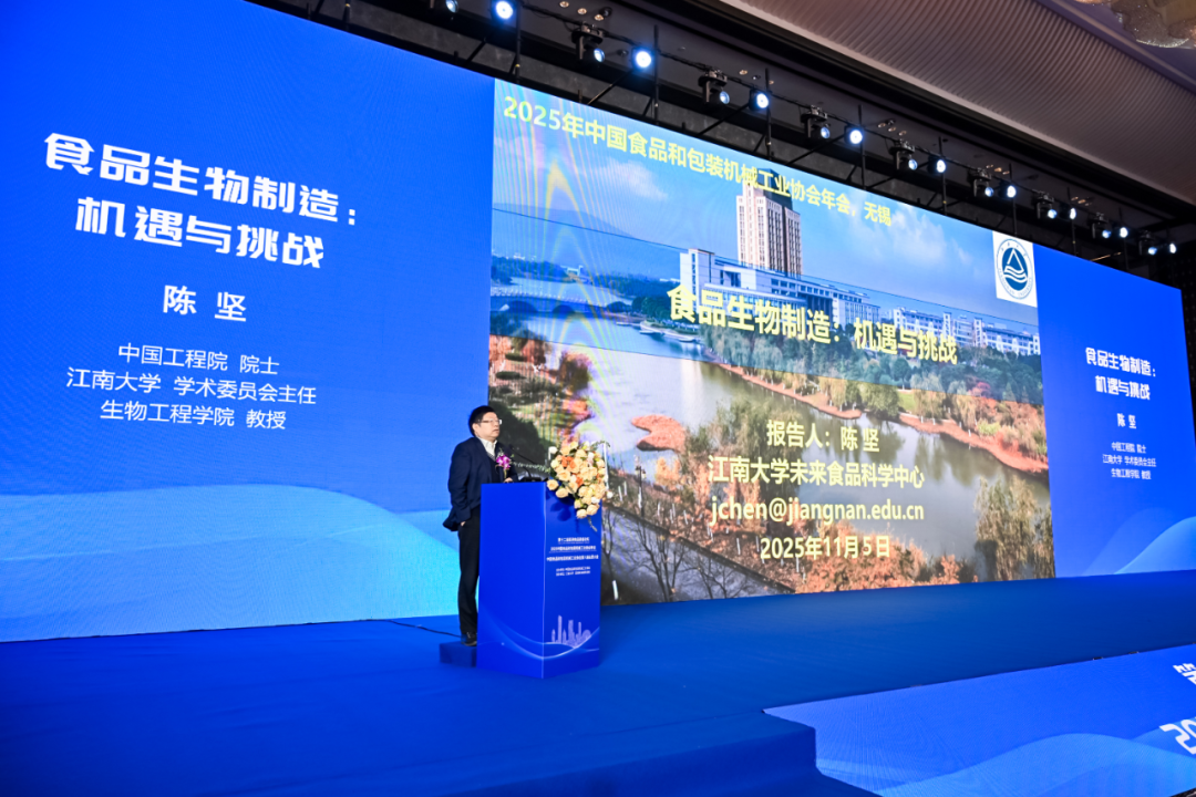 中国工程院院士、江南大学学术委员会主任陈坚,围绕“食品生物制造技术的创新与应用”,指出该技术是食品工业在数智融合趋势下转型升级的关键,通过前沿技术可实现食品原料定制化生产和营养价值提升,推动行业向新发展。